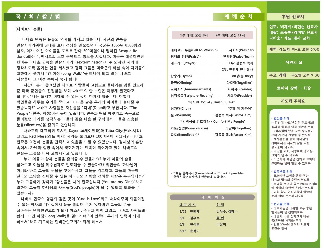[선교 후원 야드 세일] 선교부에서 나바호 선교 후원을 위해 준비한 야드 세일이 5월 31일(토요일) 오전 8시부터 있습니다. 야드 세일 물품 도네이션을 주중에 교회로 가져다 주시거나 픽업이 필요하면 안명제 집사님께 알려주십시오.