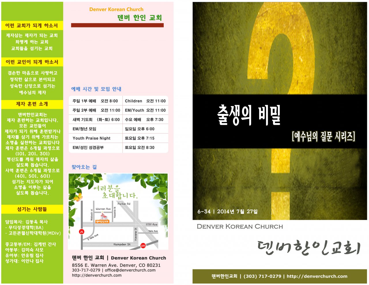 [제자훈련 2기생 모집] 8월 3일부터 시작될 제자훈련 2기생을 모집합니다. 제자훈련은 말씀을 통해 예수님께서 원하시는 신앙인의 성숙을 이루기 위해 훈련 받는 덴버한인교회의 성경 교육 과정입니다. 참석하기 원하시는 분은 김동욱 목사님께 알려주십시오. (화요반 오후 8시 / 주일반 오후 2시)