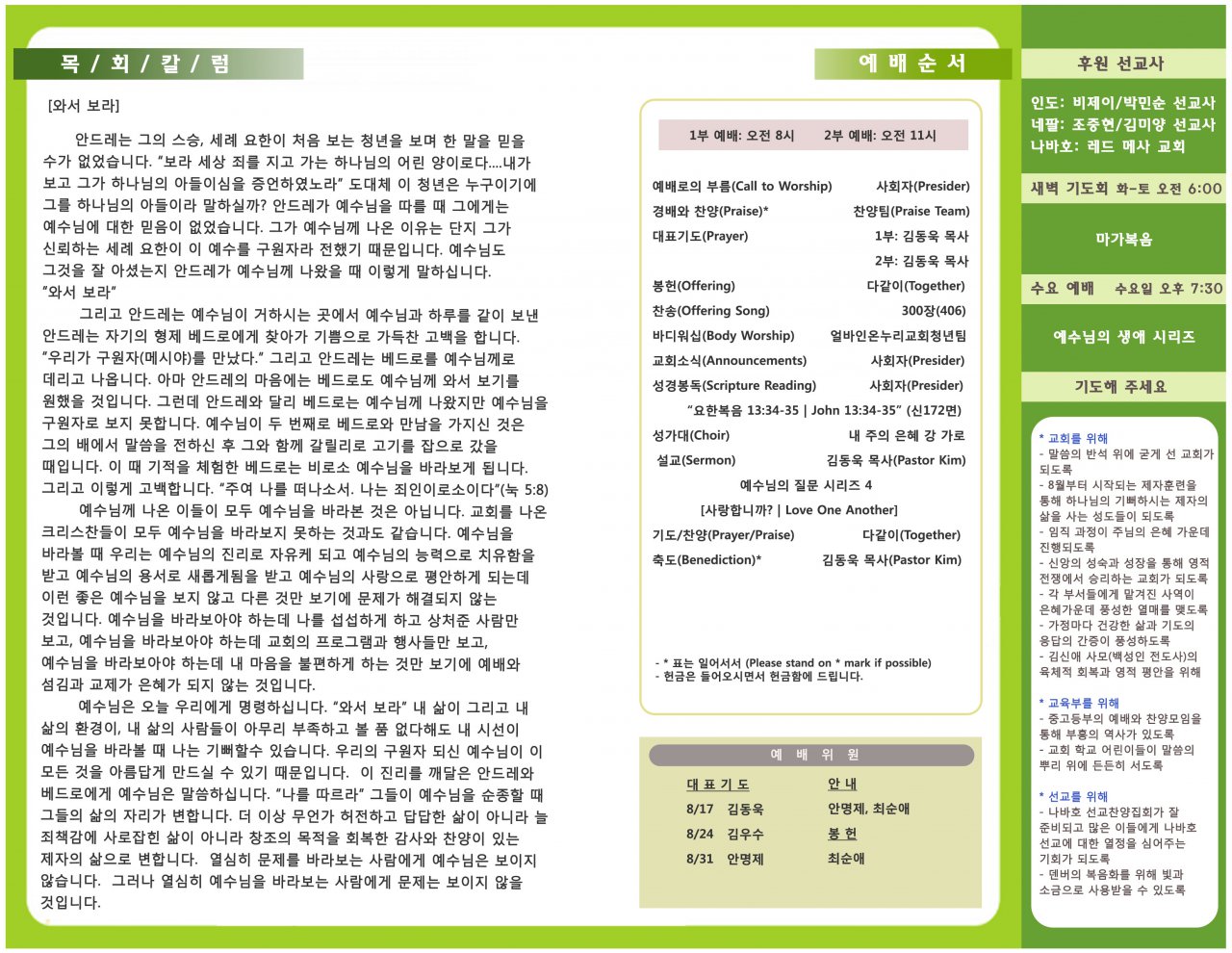 [여선교회/남선교회] 8월 24일 점심 친교시간에 여선교회와 남선교회 모임이 있습니다. 여선교회는 친교실에서 남선교회는 아동부 예배실에서 모입니다.