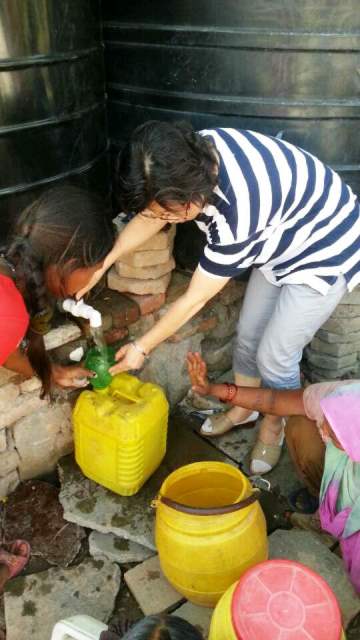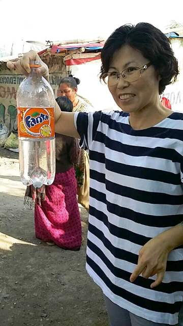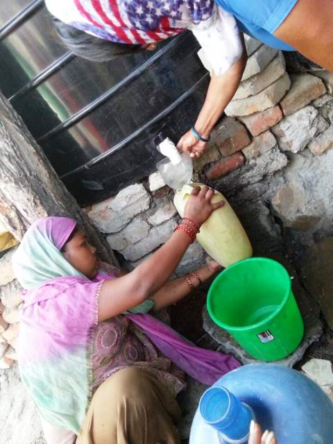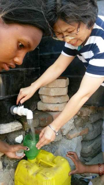 이런작업이3주계속되다 오늘 드디어 정수된 물을 주민들에게 나누어주기 시작했습니다.