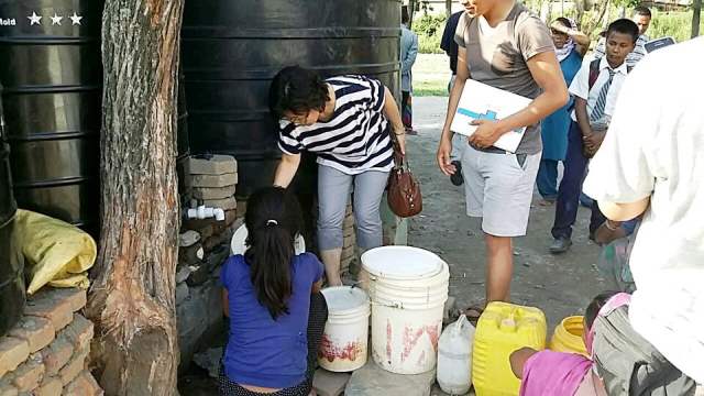 지진으로 인해 마실물이 없어서 대형 정수기를 설치하고,